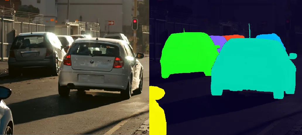 In urban datasets, masks are often used to isolate vehicles from the background, such as roads, buildings, and pedestrians. For example, when annotating images for autonomous driving models, accurately separating cars, buses, and bicycles from their surroundings ensures the model focuses on the features of the vehicles themselves, improving object detection and recognition performance.
