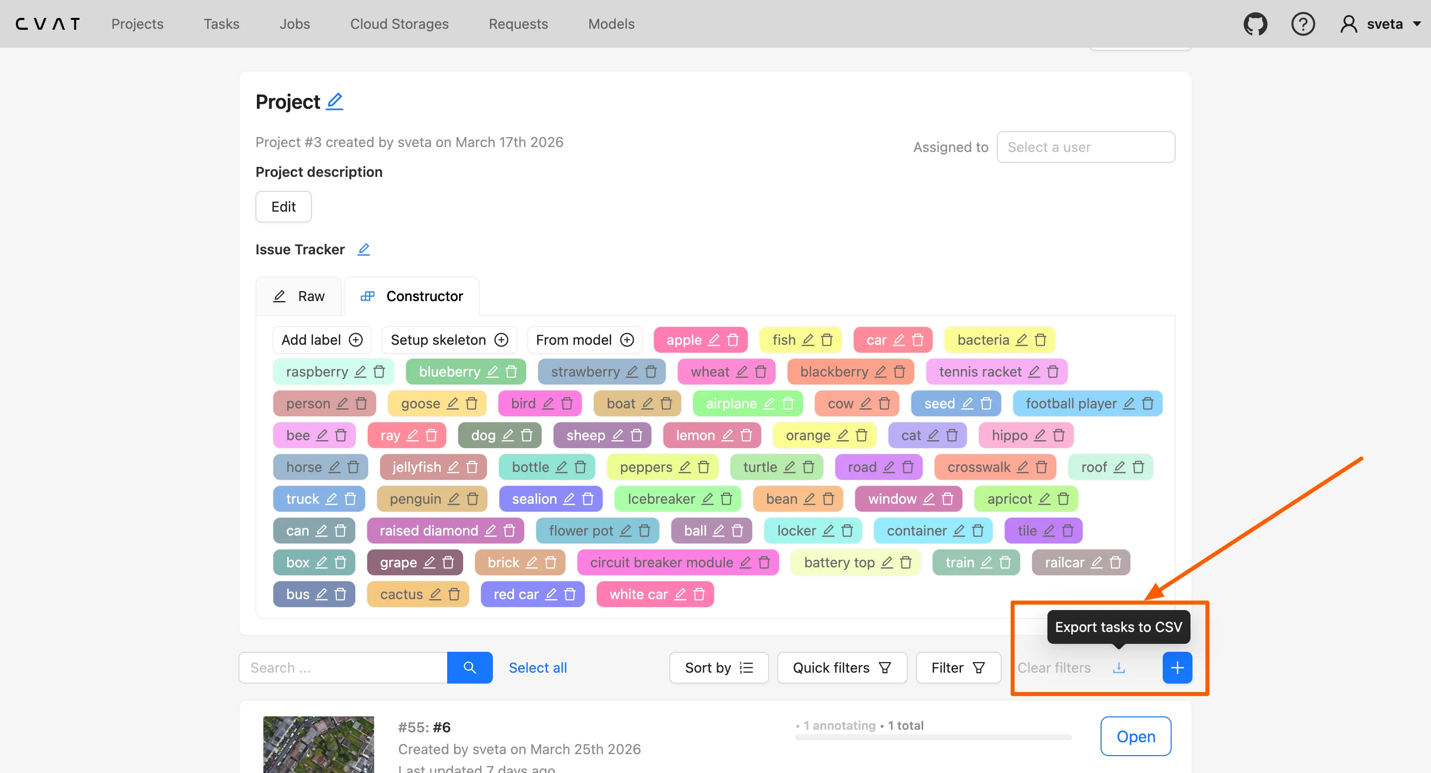 This is a small feature, but it removes a lot of manual copying for teams that regularly work with project, task, and job metadata in CVAT. Instead of rebuilding lists by hand, you can now filter what you need in the Dashboard and export it directly as CSV.