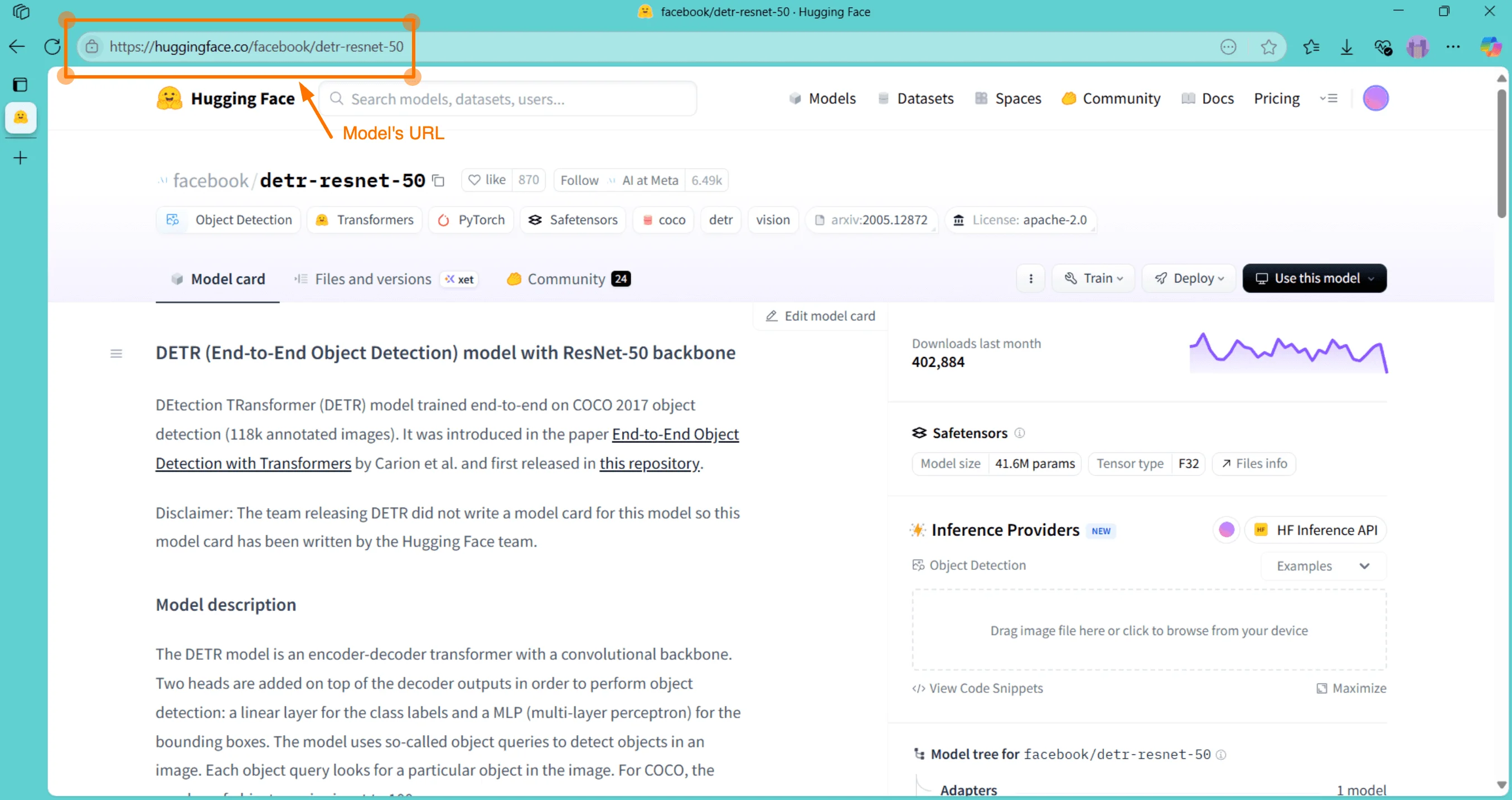 To integrate Hugging Face models with CVAT, first create an account on the Hugging Face website. Access your User Access Token from the settings page once you have logged in. Choose a model from the list of available models. Same as for the Roboflow, keep in mind that CVAT integration only supports image classification, object detection, and image segmentation models. Once you’ve clicked on the model’s name, you will get the model URL.